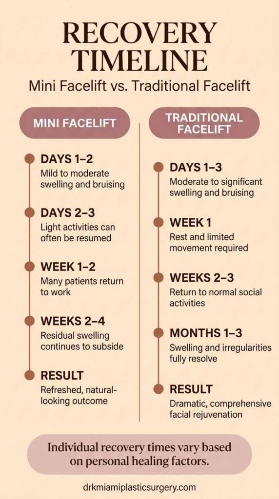 Mini facelift recovery is generally shorter, with patients often returning to normal activities within 7-10 days. Swelling and bruising are usually less pronounced compared to traditional facelifts.